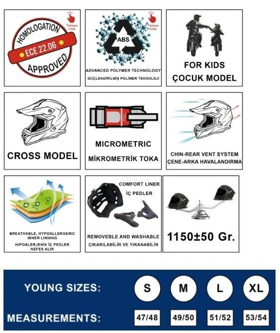Sway SW-618, çocuk motosiklet kullanıcıları için özel olarak geliştirilmiş vizörsüz çocuk cross kaskı modelidir. ECE 22.06 güvenlik sertifikasına sahip olan bu kask, küçük yaş grubu sürücüler için maksimum güvenlik, rahatlık ve nefes alabilir yapı sunar. Hafif yapısı sayesinde çocukların baş ve boyun bölgesine yük bindirmez, güvenli ve keyifli sürüşler için ideal bir tercihtir.